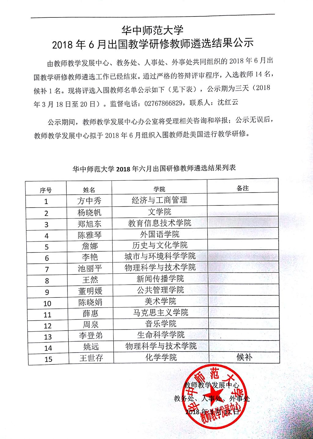 华中师范大学2018年赴美研修种子教师遴选结果公示